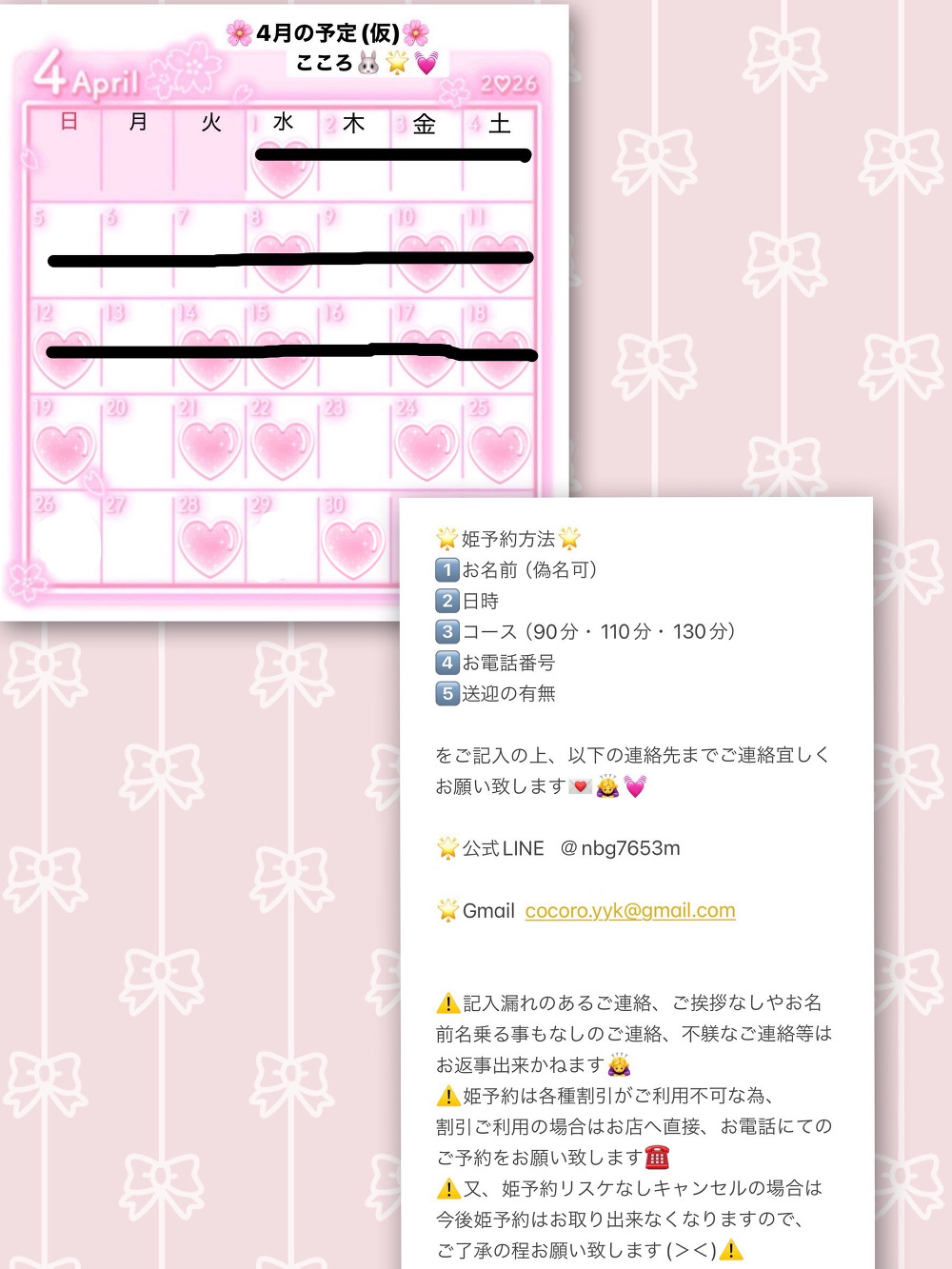 (余談なのですが、4月はこころのお誕生日月(4/27)なので、遊んで頂けたらとてもとても嬉しいです🎂🥹 お会い出来る事が何よりのプレゼントなので、もし宜しければお時間合うお兄様は宜しくお願い致します🌸)